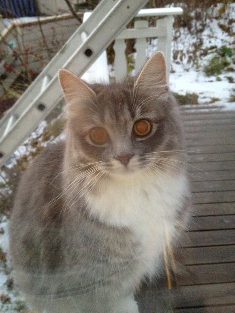 Hun er grå og har en grå kraftig hale. Hvitt bryst, hake og hvite "sokker". Ikke lenge siden hun var sterilisert så hun er ganske korthåret i buken.