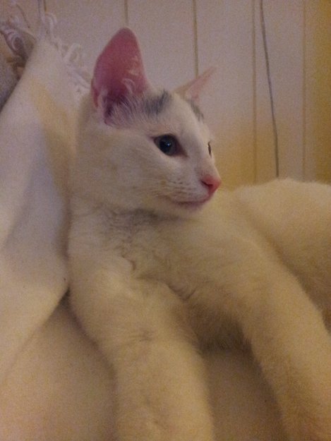 Kattunge som har vandret alene utenfor i noen dager. Den var tynn og er nå inne og fått mat/drikke.