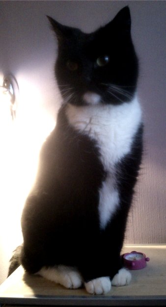 Hunnkatt. Sort med hvite tegninger: Hvit på hake og bryst, korte sokker foran og lengre bak. Hvite værhår. Gule øyne. Ikke ID-merket. Usikkert om sterilisert (veterinær ikke sikker). Har en kul (med arrvev) på buken. Trolig rundt 4-5 år gammel. Tam og kosete.