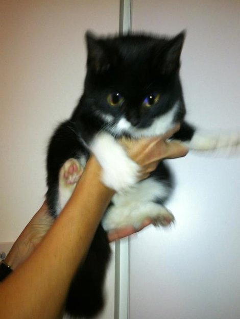 Kattungen har oppholdt seg rundt et hus i 2 dager, mjauet og vil inn. Sort og hvit. Korthåret. Ca 4 mnd.