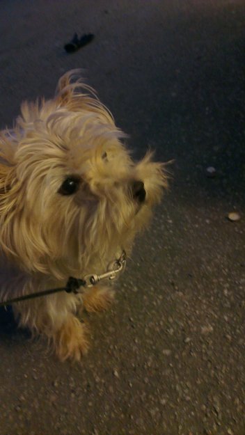 Var litt stresset, redd og ganske kald. Den hadde på seg en grønn halvstrup og en krok etter et kobbel. Antageligvis har han slitt seg på tur eller lignende.