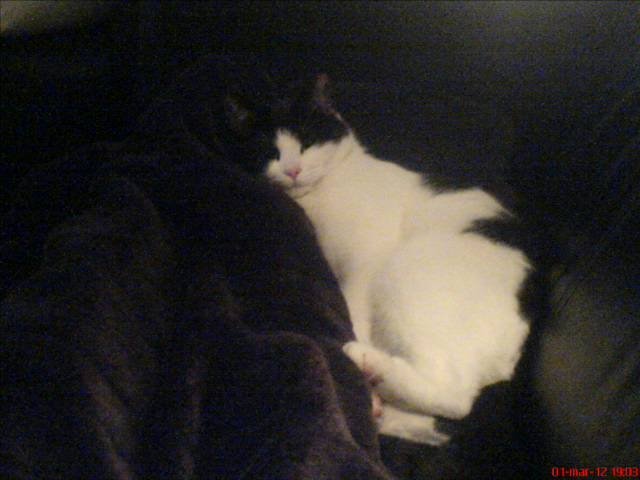 Svart og hvit huskatt. Veldig kosete og lyder godt navnet Tanja (Tantan). Hun biter negler og leker mye med halen sin:-)