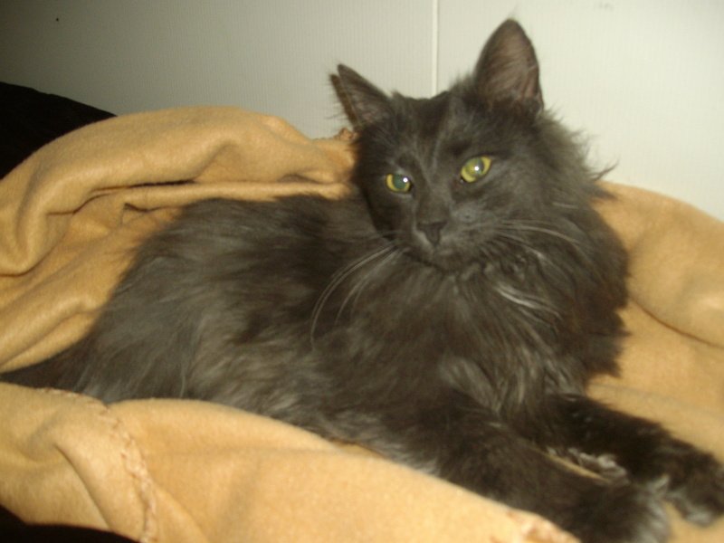 Denne katten har vandret rundt om på gården vår i flere måneder på jakt etter mat. Førsteinntrykket var at det var en villkatt, da den var veldig redd og sprang bort hver gang vi nærmet oss. Snart begynte vi å sette ut mat, noe som gjorde at han omsider viset oss tilitt. Vi syntes synd på han pga kulda som er ute nå, og fikk derfor brakt han innenhus. Den samme kvelden fikk vi røre han og etter noen timer ble han utrolig nok husvarm og kjælen, noe som kanskje tyder på at han har hatt et hjem før? Han er enormt tynn, og veldig liten til hannkatt å være. Veldig kosete og glad i å få stryk på magen. Pelsen er noe tynn og pistrete. En kjempe snill og fin katt med godt sovehjerte og god apetitt.