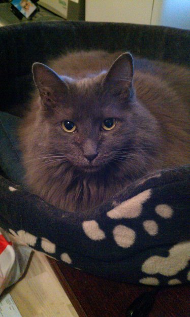 Grå, arr på ene øret (hårløst område). Lodden og lubben. Kan være veldig skeptisk til fremmede. Pratsom