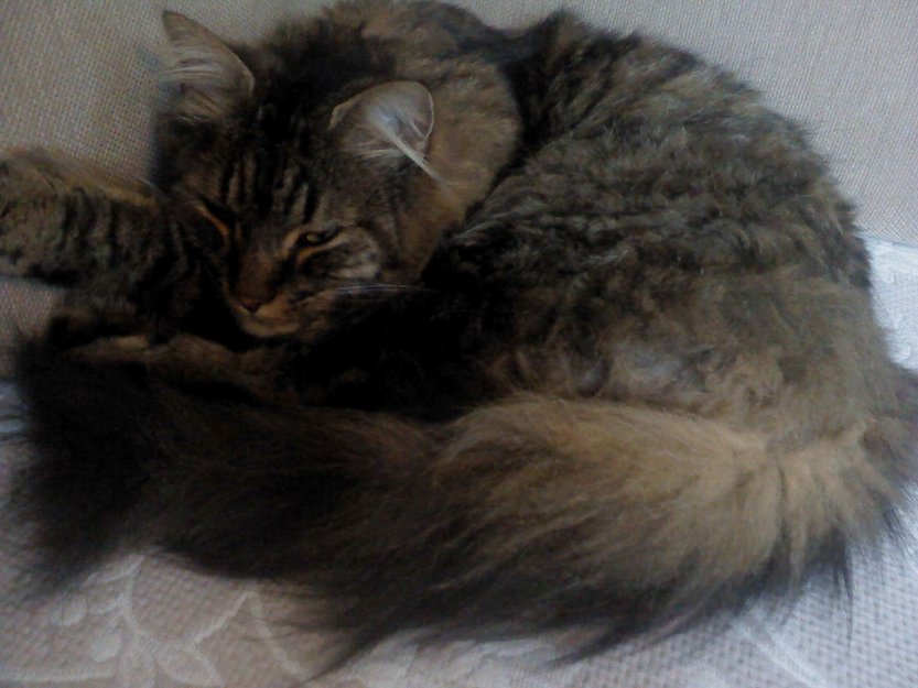 Ganske stor, veier over 5 kg. Stor buskete hale!