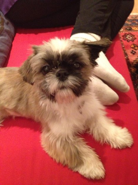Hun er en kortklipt Shih Tzu med litt svart snute, hvit hake, krave og bryst og brun kropp. Hun er lita, kanskje 4 kg. Har et rødt halsbånd. Et øre står litt opp, faller ikke helt ned.