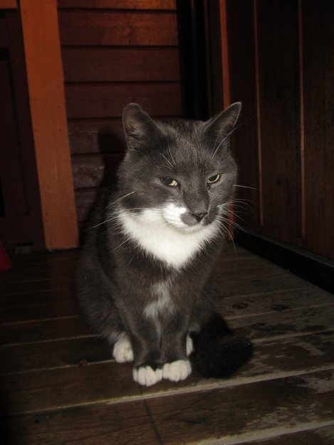 Lusket rundt huset. veldig sulten å masete katt som ville inn. Katten holdt seg rundt huset i mange timer på kvelden selv om det blåser og regner så syntes jeg det var rart at katten ikke hadde ratt hjem til matmor eller matfar.