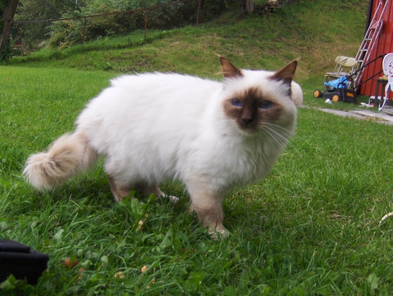 Alessi har lys beige kroppsfarge, sjokoladebrune bein, lys brun hale, sjokoladefargede ører og maske. Han har knallblå øyne :)