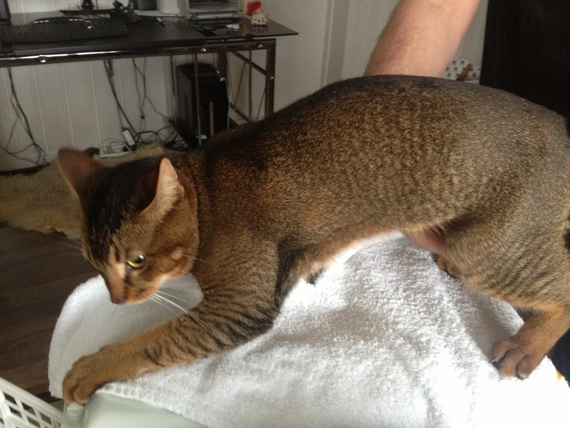 Slank og smalt ansikt er en voksen kattunge snill og kjelen.stripet på siden,beina ,brystet,ansiktet ingen halsbånd ikke kastrert