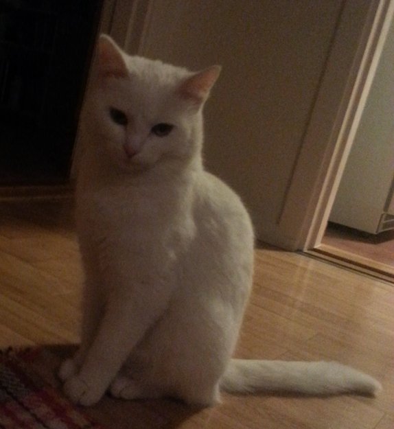 Sushi, helt hvit blandingskatt. et og ethalvt år gammelt. Operert for brudd i høyre bakben lørdag 5.1.2013. Rømte fra veterinær som hadde henne til observasjon natt til mandag 7.1.2013 i Granåsen, Fetsund.