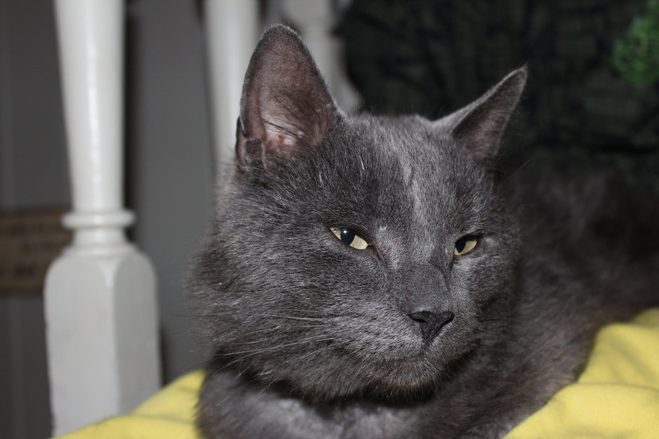Helblå hannkatt, tillitsfull og kosete da han først ble tatt inn.