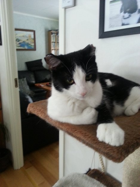 Liten svart og hvit liten pusefrøken på ca 6-8 mnd. Hun har felt tenner og fått nye, så vetrinær antok hvertfall 6 mnd.