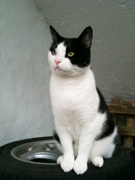 Stor 7kg kastrert sort og hvit hankatt, korthåret. Gulgrønne øyne og rosa snute. Har en tattovering i det ene øret hvor det står ID, som betyr at han er chippet (chippen kan leses av hos veterinær). Er veldig glad i mat og kos, men litt var for ukjente folk.