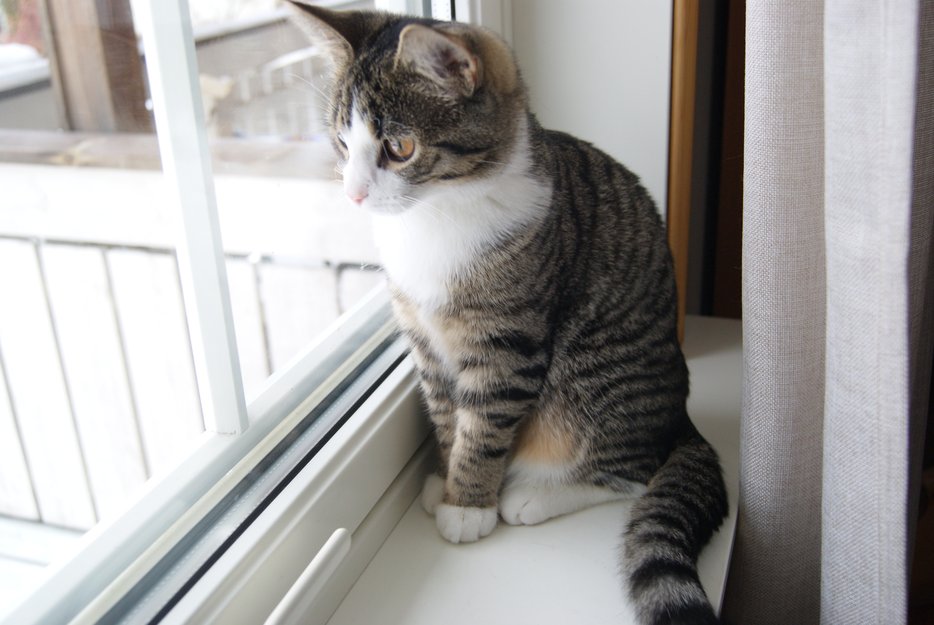 Katten er merket med id chip i øret og er sterilisert. Tigerstripet med hvite labber og hvit på hals og snute. Svarte striper og noen beige flekker og en svart stripe nedover ryggen og ned på halen. Hun er også hvit på magen.