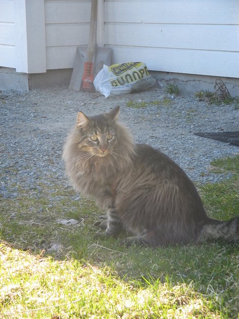 Fritz er en flott hannkatt på ca 5 kg. Det er nok litt skogkatt i han,så han har mye pels og en lang,fin,bustete hale!