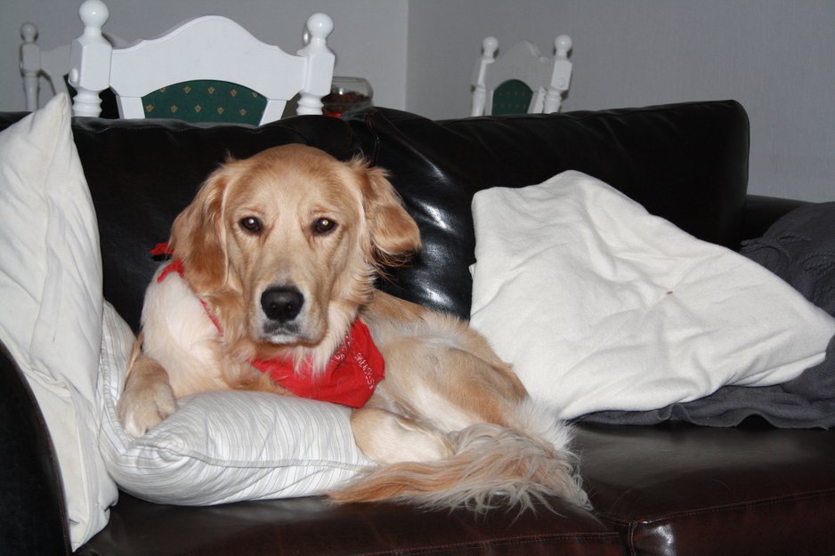 Han har på seg et rødt skjerf og et brunt skinnhalsbånd.