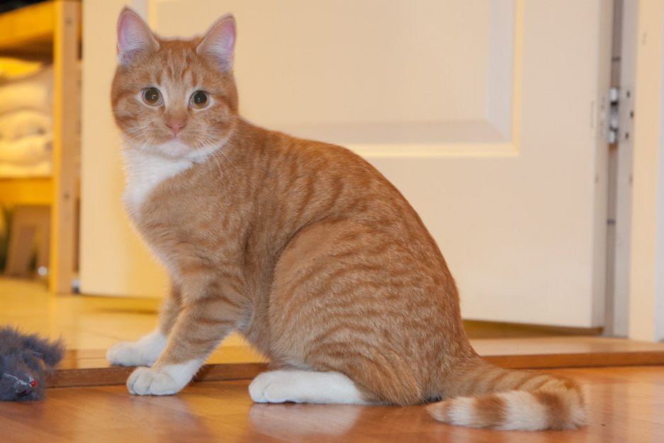 Ukastrert hannkatt, ca. 1 år gammel, kanskje litt yngre. Leken, kosete og tydelig menneskevant. Stripete hale (rød/orange og hvit), hvite sokker og hvit fra under munnen og ned på halsen/brystet. Lukter litt garasje/eksos, så det er mulig han har vært innestengt en liten stund. Tørst og litt sulten når han ble funnet, men ikke desperat.