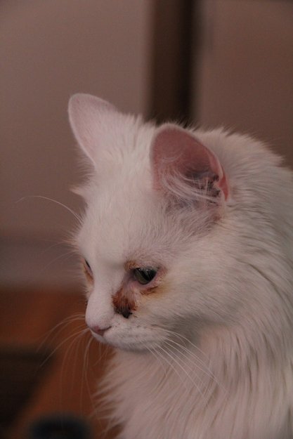 Flere i borettslaget hadde sett en ukjent hvit katt gående ute flere dager på rad. Han hadde mjauet på dører og ville inn til flere folk. Jeg tok han derfor inn da det var mistanke om at han var kommet bort fra hjemmet sitt.