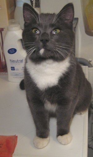 Ung tillitsfull ukastrert hannkatt, grå og hvit korthåret