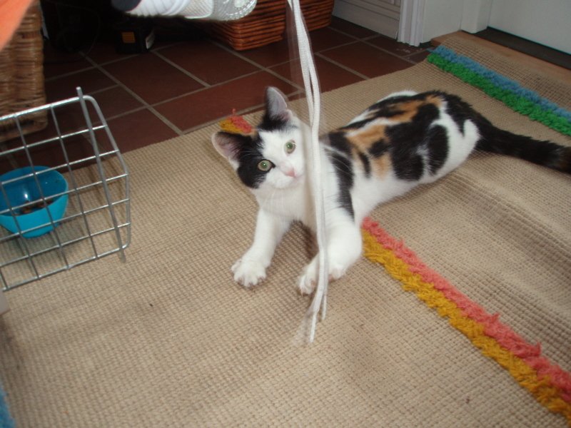 Katten har oppholdt seg rundt Utleira skole i noen dagen før den kom hit. Den var svært sulten og tørst og litt tørr i pelsen. Svært kos og tydeligvis vant med folk.