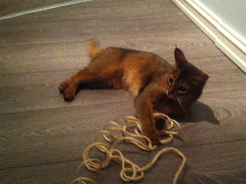 Katten er frisk og fin men lette etter eieren sin. Hun har fått mat, men ville straks ut igjen.