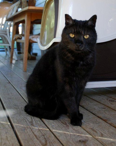Hannkatt med kort, svart pels og lys underpels, forsvant fra Langmoheia på Mo (i Rana) 1. februar 2013. Han er litt opp i årene, men ikke spesielt stor. Høyre øre mangler tuppen. Han har gulbrune øyne, og en tydelig brun flekk på høyre øye. Han er veldig hjemmekjær, og har hatt det tøft før han kom til meg. Han er veldig kosen og god. Han mjauer vanligvis ikke ordentlig, han gaper mest og lager en krakselignende lyd.