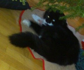 Sort med hvite poter, mage og bryst. Usymmetrisk hvitt område på snuten. Skogskatt. Hadde på seg et halsbånd med en liten magnetkule, men det kan ha falt av.