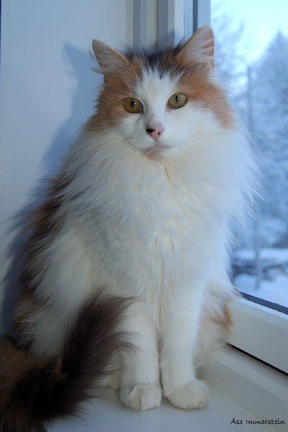 Lang pels, men er veldig tynn når du kjenner på kroppen hennes. Lett katt. Svart prikk på nesen.