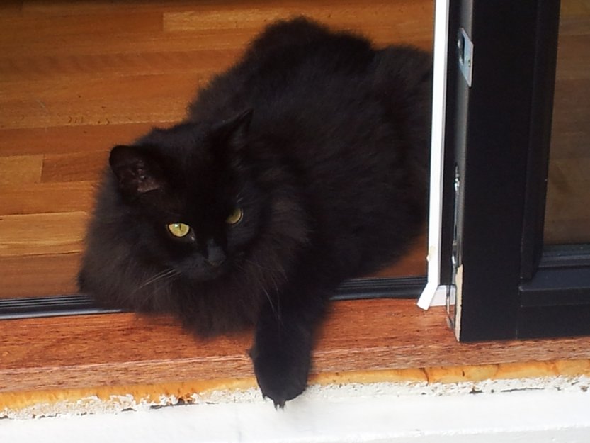 Monster er en stor katt. Den har en tykk buskete hale. Katten er helt sort - og er langhåret. Har muligens blitt skadet - så kan være sky, og kan ha gjemt seg. Er vant til å være ute.