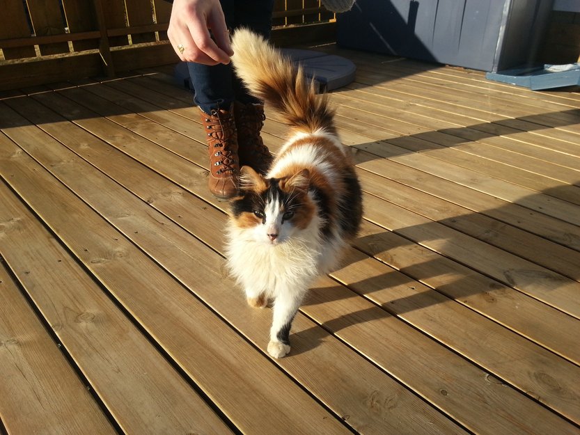 Virker som en ung katt. Utfra tennene anslår dyrelegen alderen til å være 2-3 år. Ser ut til å komme fra et hjem, da den er husren og meget kosete (selv om den er noe skvetten). Ser ut til å ha gått ute en stund da den var desperat av sult og dessuten hadde en noe ustelt pels (hadde dannet seg pelsklumper). Kanskje den har gått seg vill?