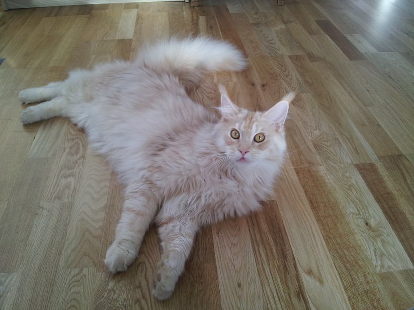 Han er stor og lys av rase Maine Coon. Lett å kjenne igjen da de har lange tufser på ørene.