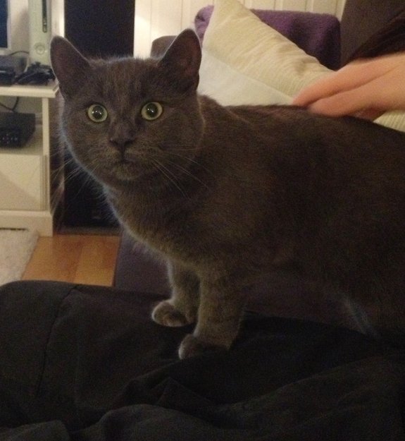 Fant en ung helgrå katt utenfor Spar på Kyvannet i 20-tiden i kveld 08.03.13. Det virket som han ikke visste hvor han ville, og satt seg midt i veibanden hvor bilene nesten kjørte på han. Jeg plukket han derfor opp å spurte ansatte og kunder på Spar om de kjente til katten. Fikk høre at den er blitt observert i området tidligere.