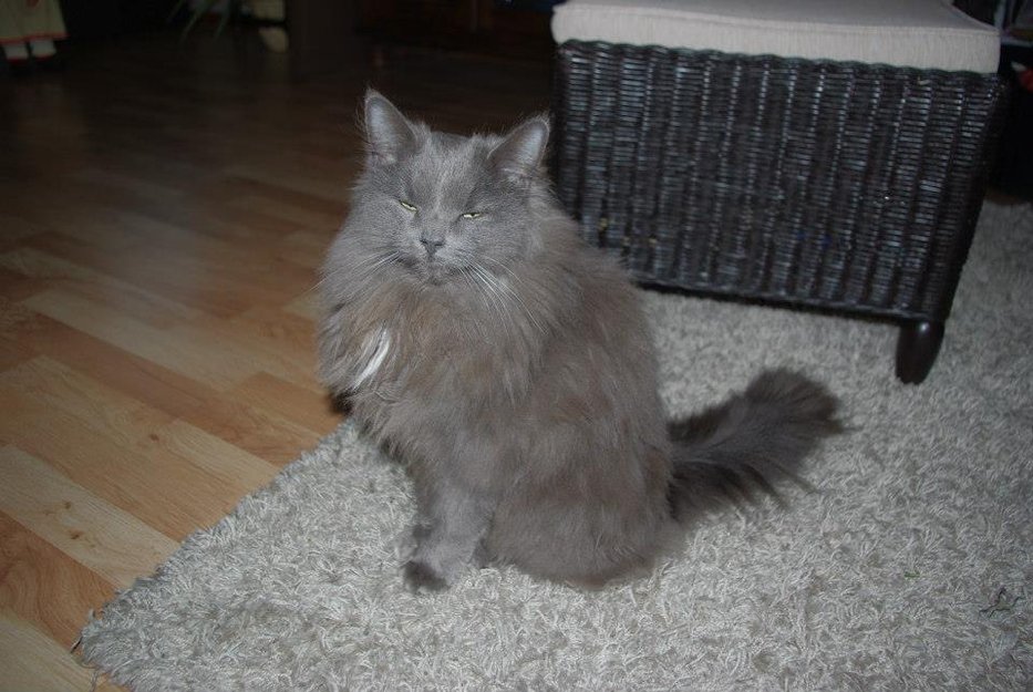 Hun har lang grå pels med en hvit tegning på brystkassa og på potene. På magen er hun lysere grå, nesten hvit. Hun godtar veldig mye at vi tuller med henne eller dusjer henne, hun er ikke glad i å dusje men hun lar oss få dusje henne. Hun er veldig glad i menneskene sine. Da vi sitter i stua ligger hun enten i sofaen eller på gulvet. Hun er rolig men kan få noen ''klikk'' da hun blir leken