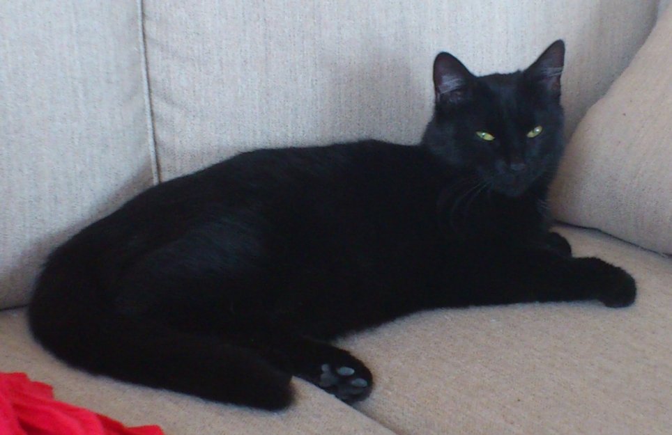 Sort med blank pels, noen få hvite hår på halsen. Kosete, men liker ikke andre katter. Virker veloppdragen og husvant