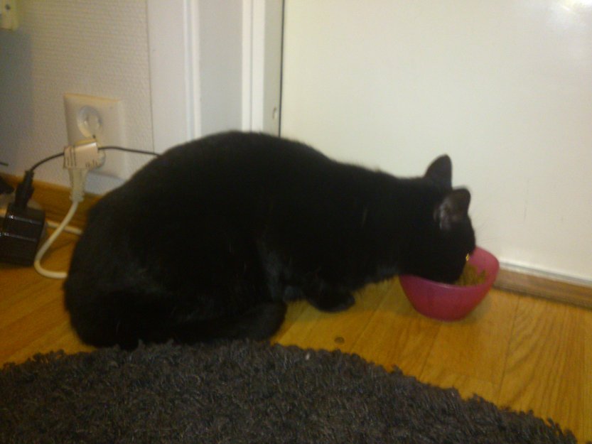 Svart liten pus som i flere måneder har vært observert på Evjen. Vi har tidligere prøvd å fange den, da den tydeligvis har vært sulten og gått løs på søppelposer. Den har ved flere anledninger ligget i huset til vår katt, men den har stukket av før vi har fått tak i den. Pusen er nå inne, og har fått mat. Den var veldig kosete da den hadde fått spist, så tydelig at den er vant med mennesker, allikevel er pus veldig usikker, får inntrykk av at den har vært på løpen en stund. Pus blir tatt med til dyreklinikk mandag, for å sjekke om den er chippet.
