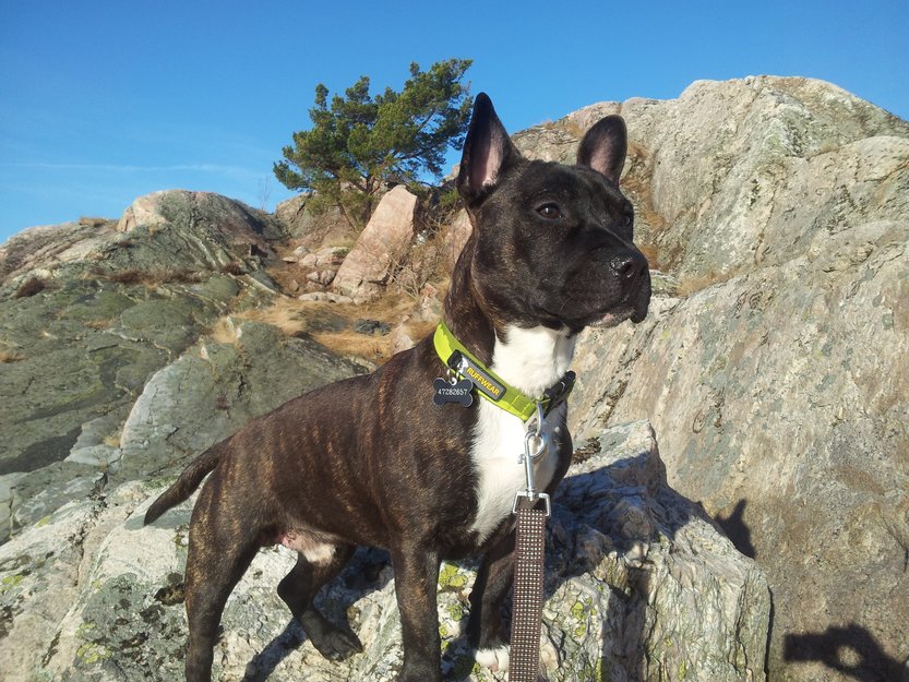 Mørk brun med tigerstriper og hvit bryst, oppstående ører og haleknekk. Han er blanding av fransk bulldog og mini bullterrier, meget sosial og en veldig energisk og happy hund. Veldig tillitsfull.