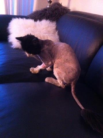 Katten er nå barbert. Den har kun pels på hode, poter og haletuppen. Den har også en svart prikk rett på nesen