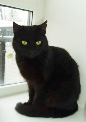Helt svart hunkatt, litt rund over magen, korte ben og ikke så veldig stor. Har en veldig karakteristisk mjauing.