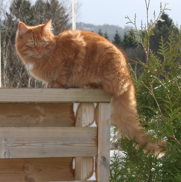 Han er ganske stor. Har en hvit flekk på brystet og magen. Det ene øret har en liten knekk.