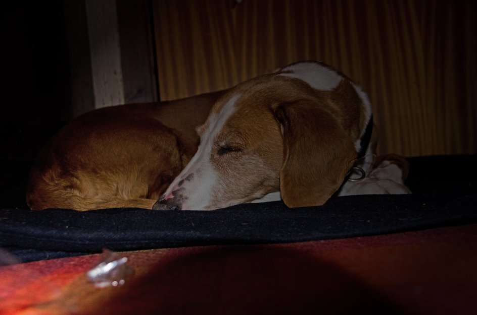 Hun hadde løpt etter en syklist hvistnok gjennom hele Voiebyen..... som stoppet og snakket med oss 2 hundeiere som bestemte oss for å hjelpe rømlingen levende hjem.... Hadde ikke halsbånd. Akkurat nå lider den ingen nød; mett, varm og sover som et barn....