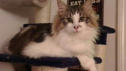 Langhåret norsk skogskatt. Litt gaupeaktig ansikt/ører, hvit maske rundt neseparti bortsett fra en liten brun flekk ved siden av nesen. Tigerstripet/spraglet i brunt og sort på hodet, brune ører, hvit på brystet og potene.. spraglete brunt/sort på ryggen og halen. Litt skvetten av seg da hun ikke er vant til å være ute. Lyder navnet Ana.