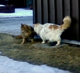 To katter, den ene yngre. begge med skitten og ustelt pels. den yngste katten mer sky enn den eldste, men ingen tillot at vi nærmet oss. Begges pels hang det dotter fra, og begge kattene gned seg mot den steinbelagte gårdsplassen som for å kvitte seg med pelsdottene.