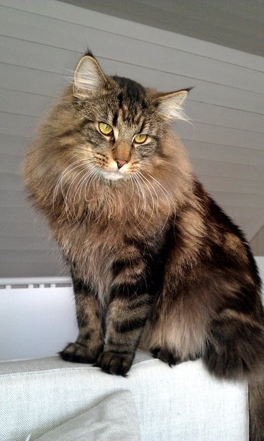 Stor hannkatt på 6 til 7 kilo. Tigret i ansikt men brun og svart spottet på kropp. Lang buskete hale. Rase Norsk Skogkatt.