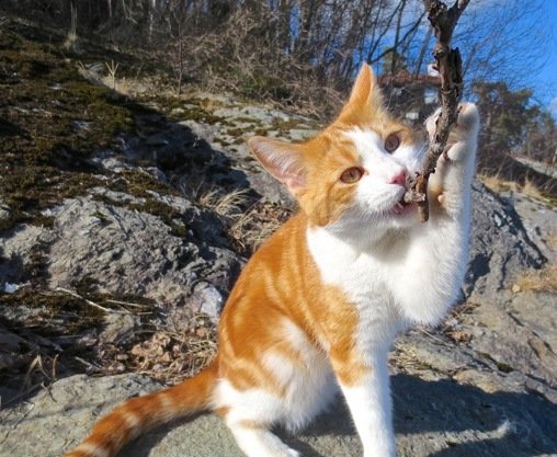 Ungkatt på 11 måneder. Rødstripete og hvit pels.