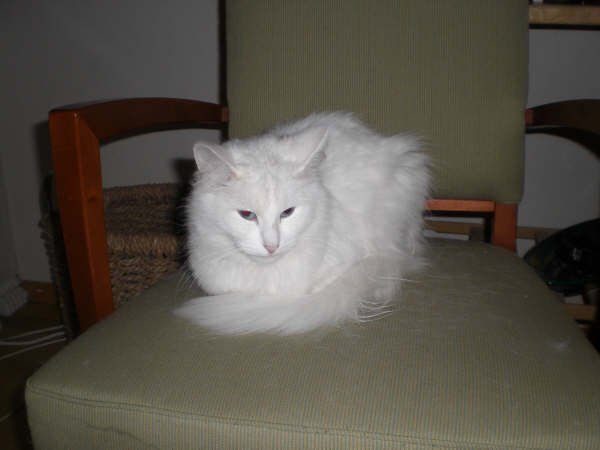 Ensfarget hvit katt, langhåret pels og blå øyne.