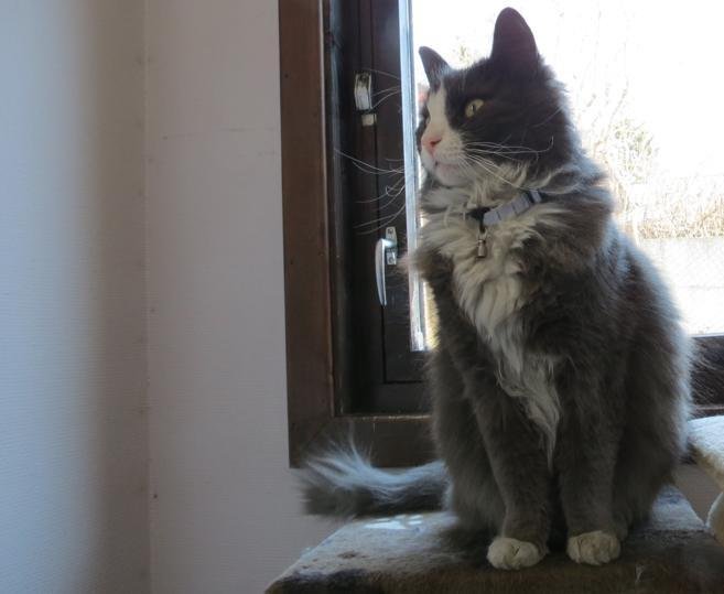 Pusen er langhåret, koksgrå og hvit. Han er kastrert men ikke ID-merket. Bar et halsbånd med hylse. Han er meget kjærlig.