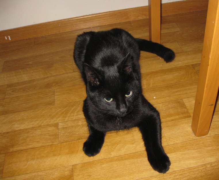 En ensfarget sort hannkatt tok tilhold på vår terrasse 05.04. Den er kjælen og tillitsfull, men var noe avmagret, vi gav den mat da den fortsatt var der dagen etter, og den var veldig sulten. Katten er under 1 år, renslig, tigger ikke, eller går på bordet. Den er ikke chipmerket, og har heller ikke noen form for visuell merking. Den savner sikkert hjemmet sitt.