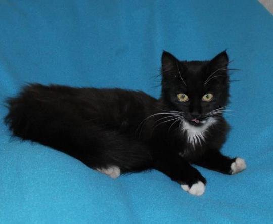 Svart med litt hvitt, semi langhåret, hvite værhår, ca 3 mnd gammel, jentepus.