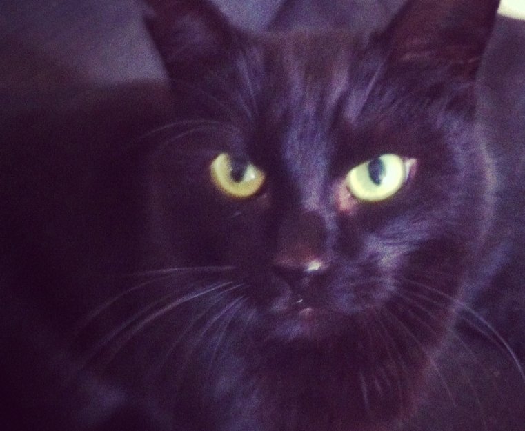 Svart, kastrert, ID merket hannkatt med hakk i øret.