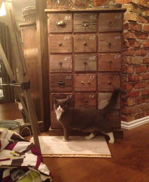 Den har fire hvite sokker og bryst og er grå ellers, virker som det er en ganske ung katt. Kan hende er den vant med hunder, vi har både hund og katt fra før.